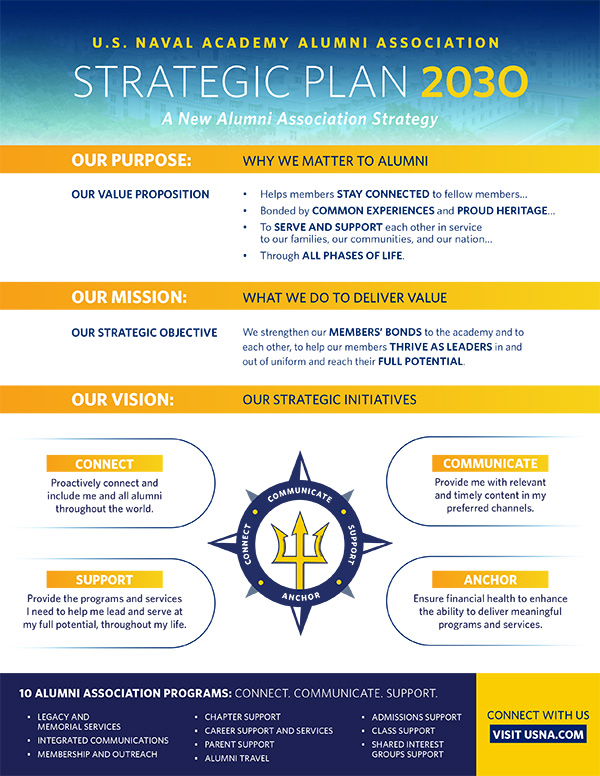 The U.S. Naval Academy Alumni Association and Foundation shares our Strategic Plan 2030. This plan was approved by the Alumni Association Board of Trustees in May 2023, and it guides how we as an organization CONNECT, COMMUNICATE and SUPPORT our members, as well as how we ANCHOR our activities and tactics through sound and effective financial execution..